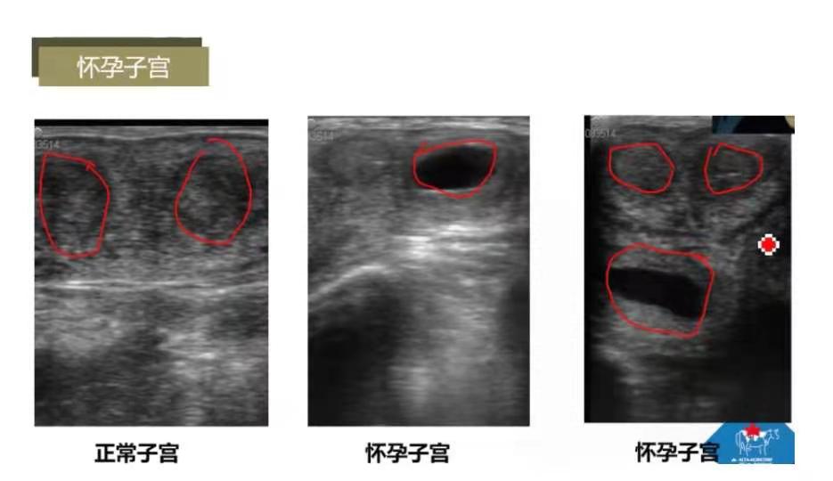 子宫成像:青年牛子宫角直径1.5-2cm,灰色;成母牛子宫角直径2-4cm;发情牛一侧子宫角开张,子宫内膜增生,发情时子宫颈口和阴道分泌粘液,流入子宫,子宫角呈现黑色。