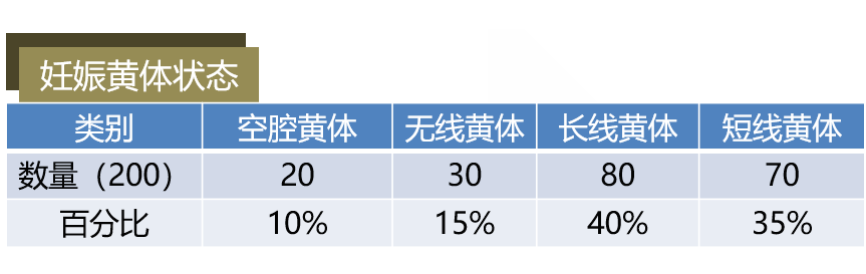 妊娠黄体有白线比例达到75%,白线为妊娠黄体的标志,黄体空腔不断填充后塌陷形成致密组织,因而会成白色。