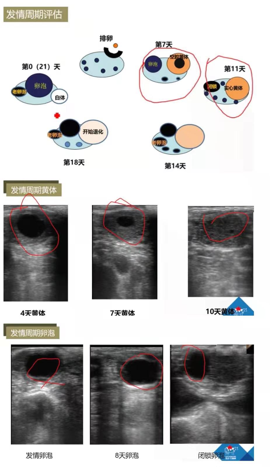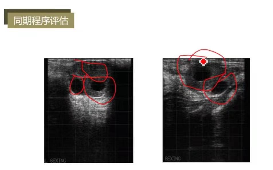 同期程序0789方案的评估节点为第7天打PG时的卵巢状态,即有双黄体是***佳状态。左图为实心黄体+空腔黄体+优势卵泡,说明同期程序执行较好;右图为空腔黄体+优势卵泡,预同步的几针无效或复旧较晚。