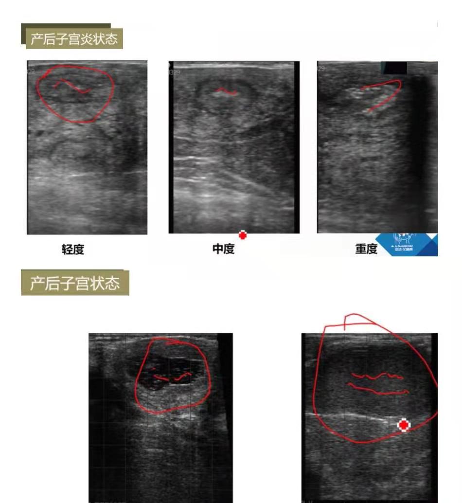 产后子宫炎:产后21天内称为子宫炎,21天后称为子宫内膜炎。评估时间产后24-30天。轻度子宫角雪花状点状,面积越大炎症反应越重