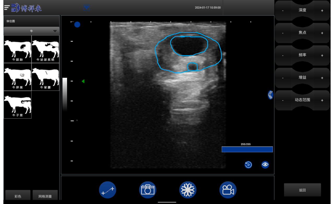 支持距离、周长、面积、圆面积等基础测量 ≥30种动物产科测量种类 |